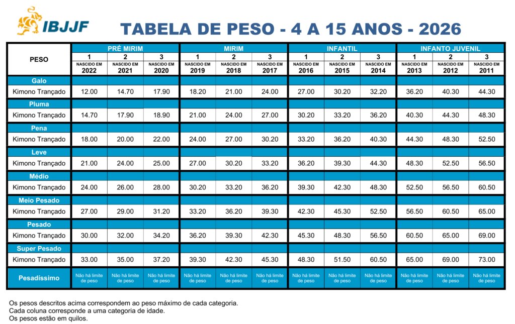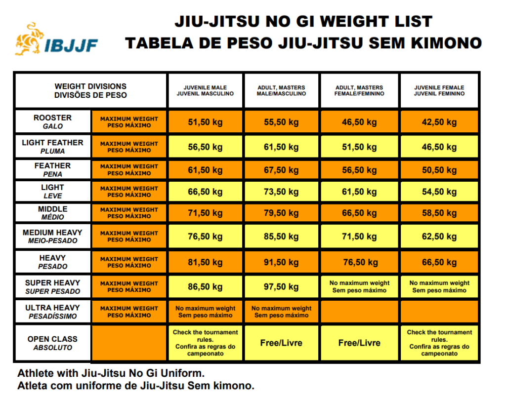 – Atenção para a categoria de peso NO-GI (Sem kimono). Usar a coluna AZUL na tabela de peso.